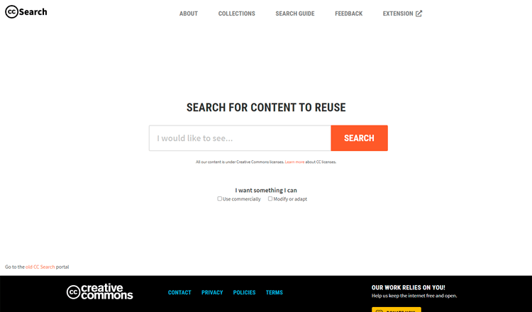 Ferramenta de busca oferecida por creativecommons.org e proporciona uma forma conveniente de acessar a vários serviços oferecidos por diferentes organizações independentes que indexam conteúdo publicado sob licenças CC. Em CC Search pode buscar vários tipos de recursos multimídia, na maior parte imagens. Pode filtrar os resultados para que ofereçam aqueles recursos que você possa usar com propósitos comercias e aqueles que você possa modificar e adaptar.